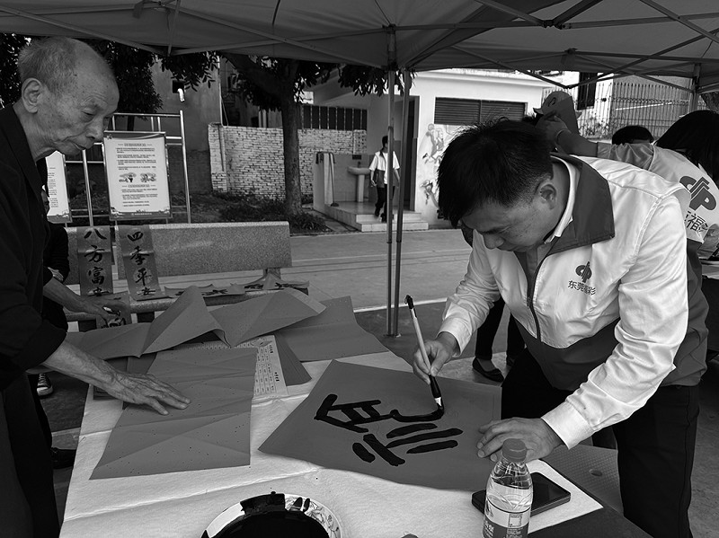 在写春联的摊位前,东莞市福彩中心安排了15名志愿者与书画爱好者一起配合,把一张张“福”字和一幅幅春联,承载着对新年的美好愿景和诚挚的祝福,送到社区群众手中。