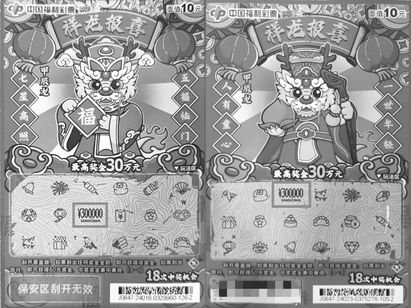 近日,山东省青岛市福彩中心兑奖处先后迎来了两位大奖得主。巧合的是,他们都是中得面值10元“甲辰龙”刮刮乐30万元的大奖得主。