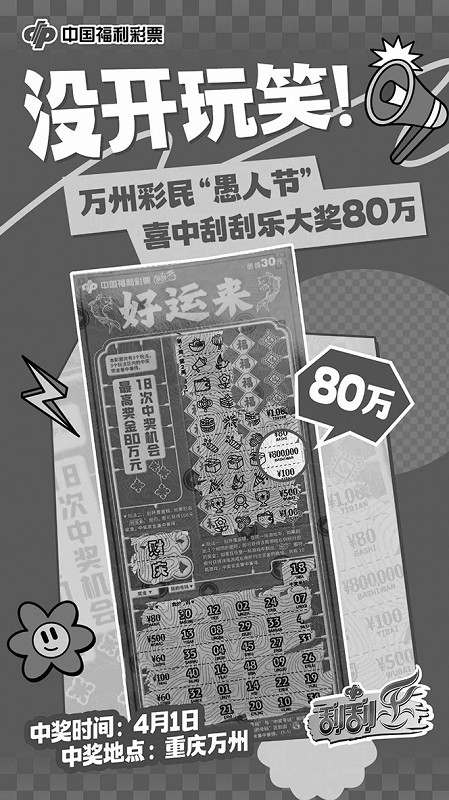4月1日“愚人节”,对于重庆万州区彩民王先生(化姓)来说,却是一个真实而又惊喜的一天。当晚7点左右,王先生和妻子在万州区一投注站购买了5张“好运来”刮刮乐,喜中大奖80万元。