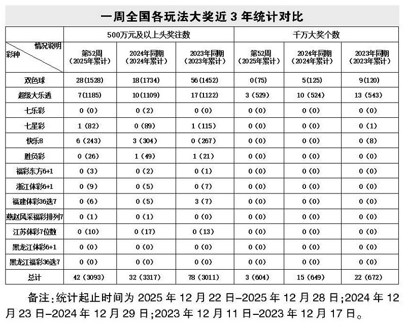 第52周,全国共有4种彩票游戏中出500万元及以上大奖。其中,双色球游戏中出28注,超级大乐透游戏中出7注,快乐8游戏中出6注,七星彩游戏中出1注。