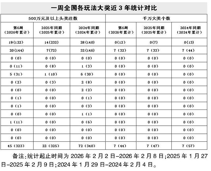 截至该周,2026年500万及以上大奖累计中出323注,其中福彩双色球游戏累计中出122注,体彩大乐透游戏累计中出144注。去年同期500万元及以上大奖累计中出325注,今年与去年同期相比数量近乎持平。