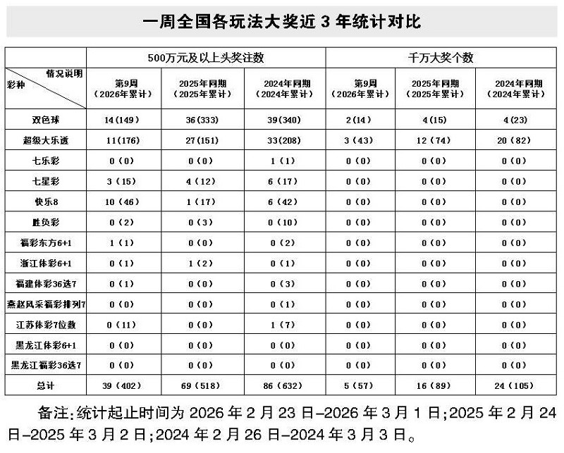 截至第9周,2026年500万及以上大奖累计中出402注,其中福彩双色球游戏累计中出149注,体彩大乐透游戏累计中出176注。