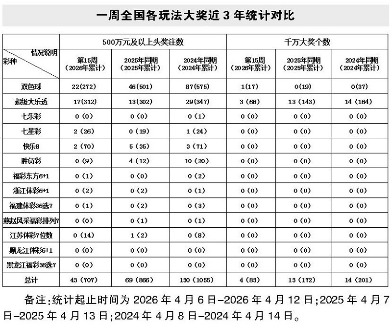 超级大乐透游戏该周中出17注500万元及以上头奖,今年累计中出312注;回顾2025年大乐透游戏单周同期中出13注500万元及以上大奖,当年同期累计中出302注;2024年大乐透游戏单周同期中出29注500万元及以上大奖,当年同期累计中出347注。2026年15周累计中出注数基本持平近两年同期。